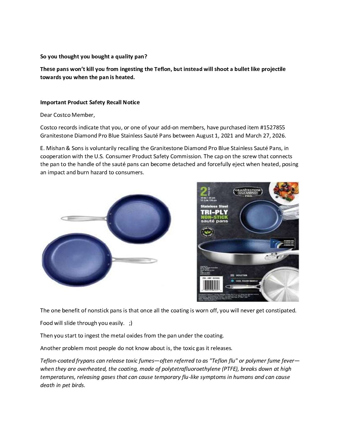 These pans won’t kill you from ingesting the Teflon, but instead will shoot a bullet like projectile towards you when the pan is heated.